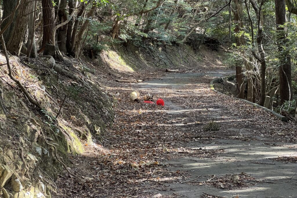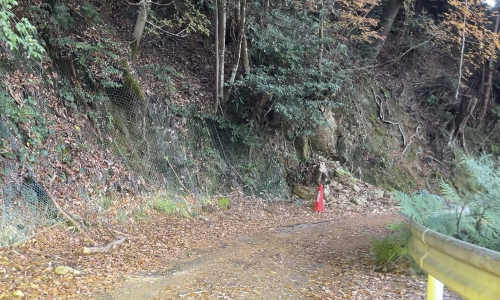 実際のところはただ落ち葉が積もっていただけでしたが、見た目はまさに険道。