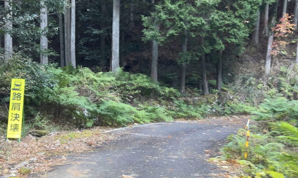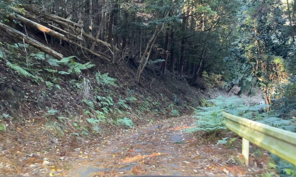苔むした道路、ガードレールが無い路肩、今にも谷底へ落ちそうなくらい傾いたデリネーター(視線誘導標)…。