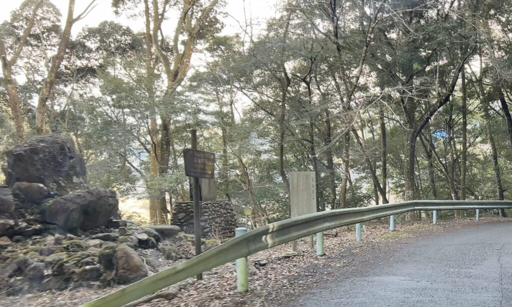 鬱蒼とした森の中、カーブの手前で現れた「権太郎石」という巨石。