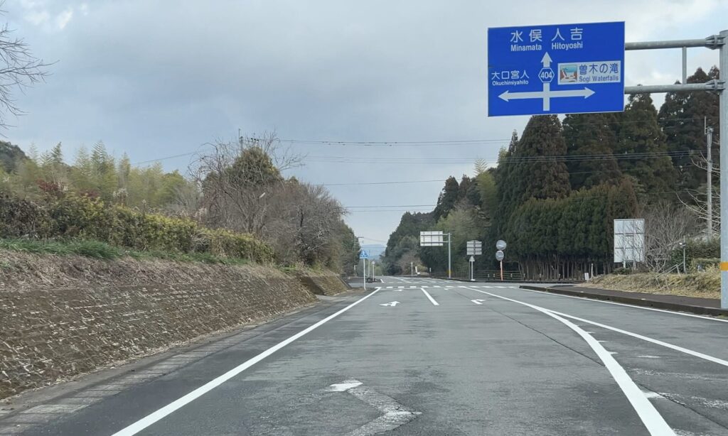 さらに走った先では広域農道「川薩(せんさつ)グリーンロード」と交差するが、ここでは県道404号側が一時停止を余儀なくされる。