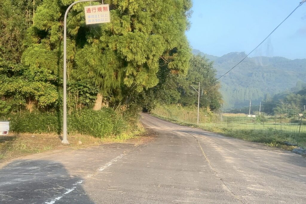 ほぼ直角に等しいカーブを抜けると、現れたのは「通行規制 車両8t以上 長さ9m以上」の看板。