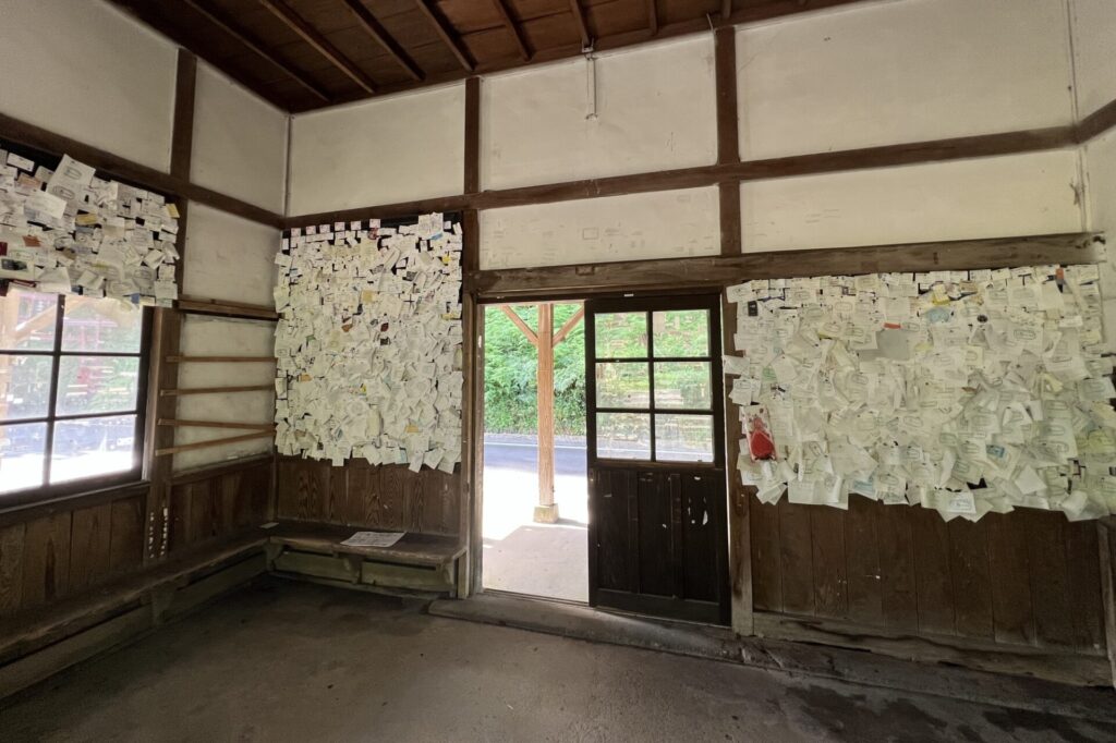 2020年の豪雨災害に見舞われて以降ずっと運休が続いていますが、ここは「名刺を駅に貼ると出世する」といわれているのだそう。