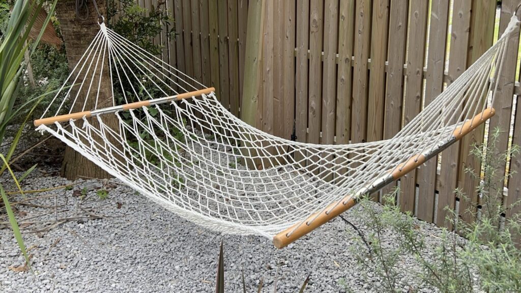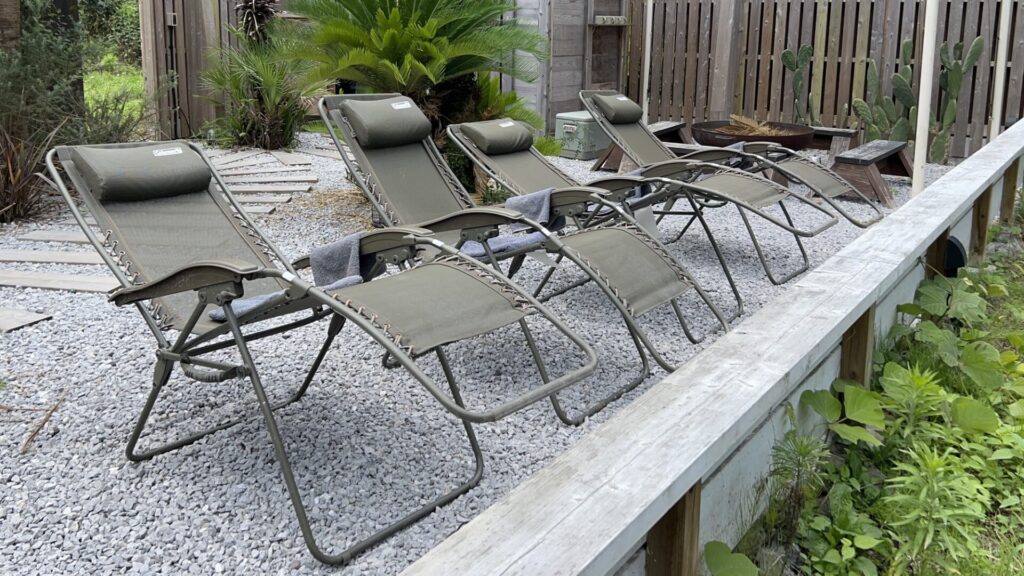 身体を冷やした後は、すぐそばにあるリクライニングチェアやハンモックで一息。
